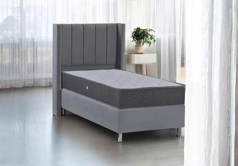 This modern single bed combines elegance, comfort, and durability. Featuring a premium upholstered headboard with refined details, it offers excellent back support and a luxurious feel in the bedroom. Its sturdy bed base ensures exceptional stability, while its high-quality fabric upholstery adds a touch of softness and sophistication, ideal for contemporary interiors.
