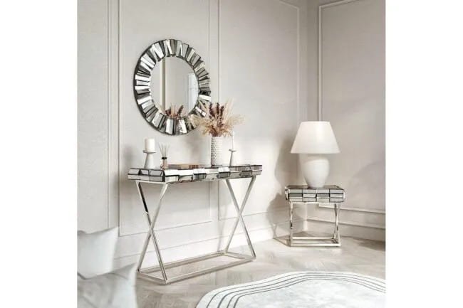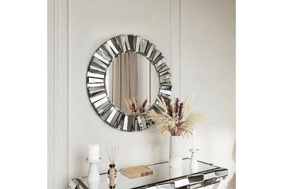 With a diameter of 80cm, it offers a generous reflective surface, allowing you to see your entire reflection. The mirror’s frame is adorned with a mosaic composed of small pieces of glass, creating a visually striking pattern.
