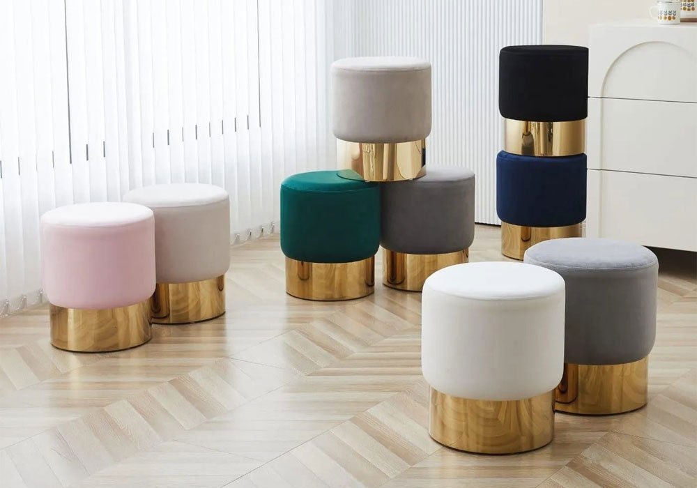 Children’s room… The ideal pouf for stretching your legs and comfortably settling on your sofa, the pouf that transforms into an extra seat for your guests. A minimalist pouf with timeless beauty and an elegant gold metal band.