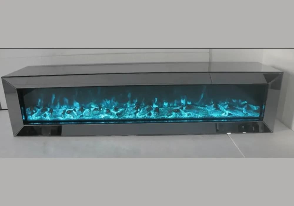 The grey mirror finish adds a modern and sophisticated aesthetic to this fireplace, creating a significant visual impact in any room. The fireplace integrates seamlessly, adding a warm and inviting ambiance to your interior.