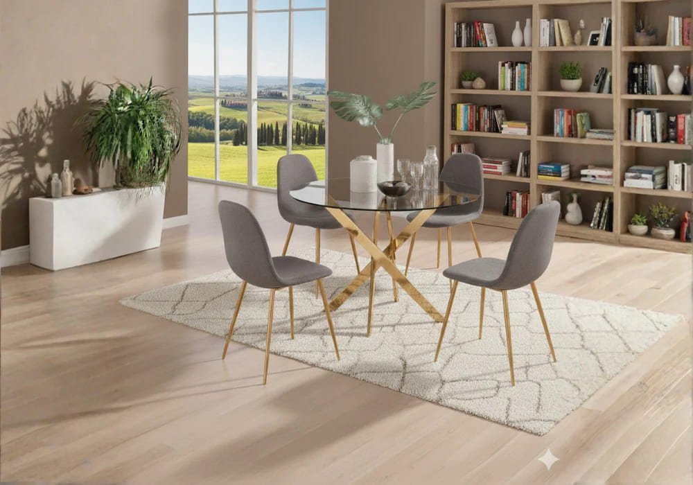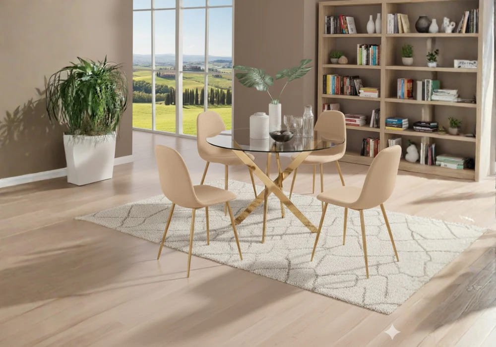 This round, modern dining set consists of a table with a high-quality glass top and an elegant gold-tone metal cross base, for a luxurious and refined style. It includes four comfortable, upholstered chairs designed for durability and everyday use. Ideal for modern homes and apartments, as well as elegant dining rooms.