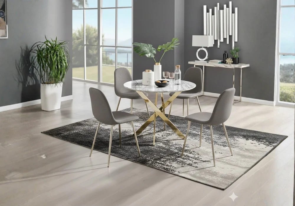 This round, modern dining set consists of a table with a high-quality glass top and an elegant gold-tone metal cross base, for a luxurious and refined style. It includes four comfortable, upholstered chairs designed for durability and everyday use. Ideal for modern homes and apartments, as well as elegant.