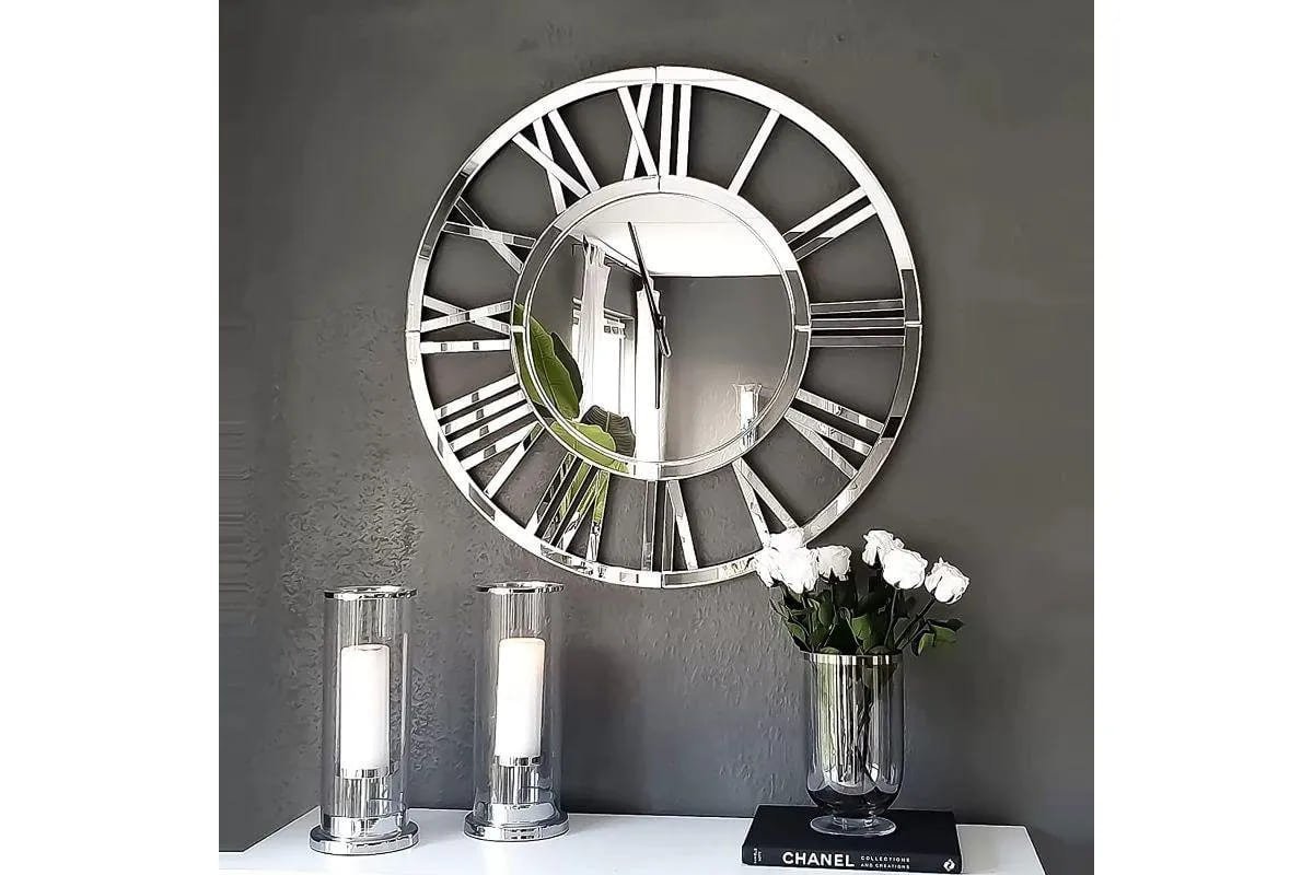 The clock face is a smooth mirror that reflects light and adds a sense of spaciousness to the room. The mirror is framed by a finely crafted metal border, giving it a refined appearance. The numerals and hour markers are also made of metal, adding a touch of contrast and style to the overall design.