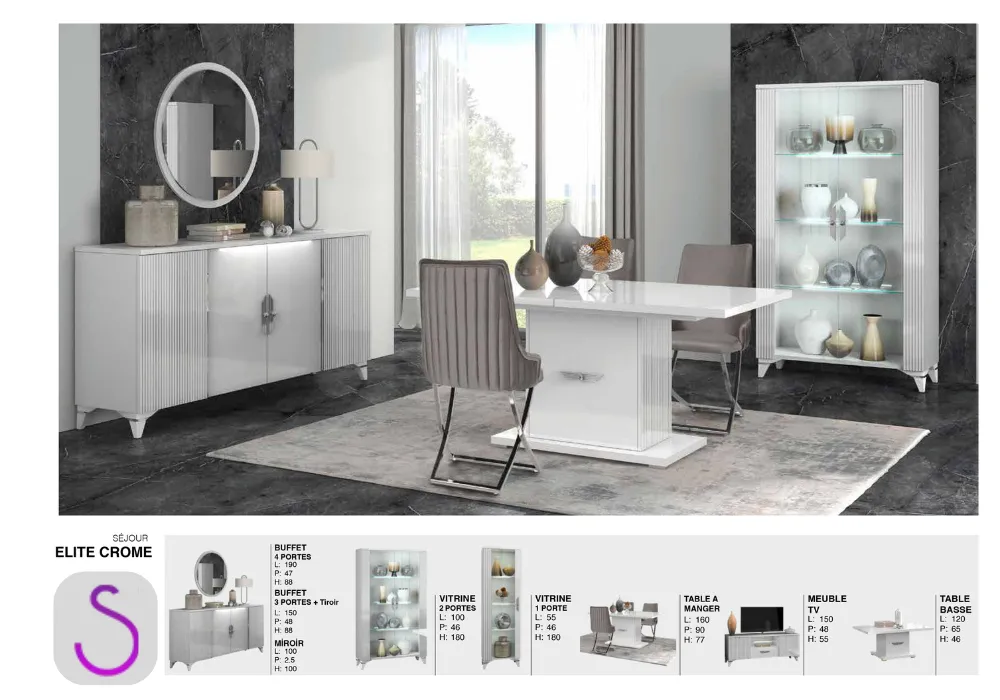 The image shows a living and dining room set. The living room includes a TV stand, a coffee table, and a sideboard. The dining room includes a table and chairs. The furniture is all white with gold accents. The style of the furniture is modern…