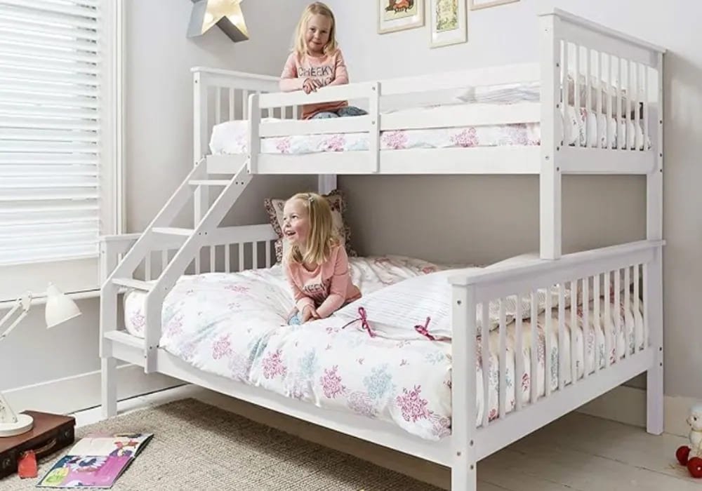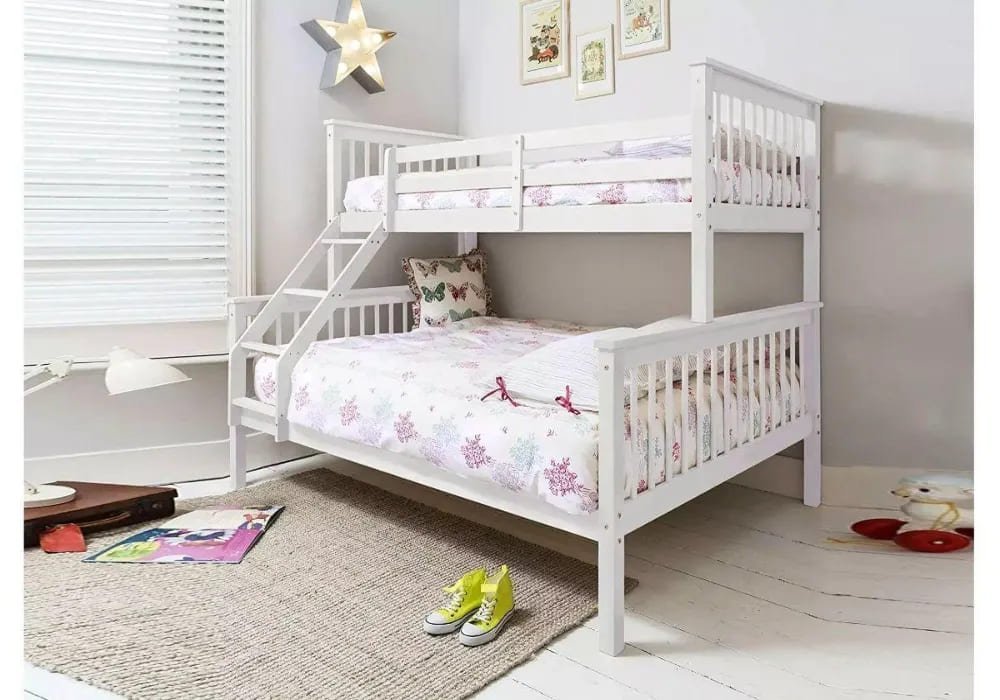 The “2+1 Wooden Bunk Bed – (White)” is a wooden bunk bed designed to accommodate three people. Here is a complete product description: